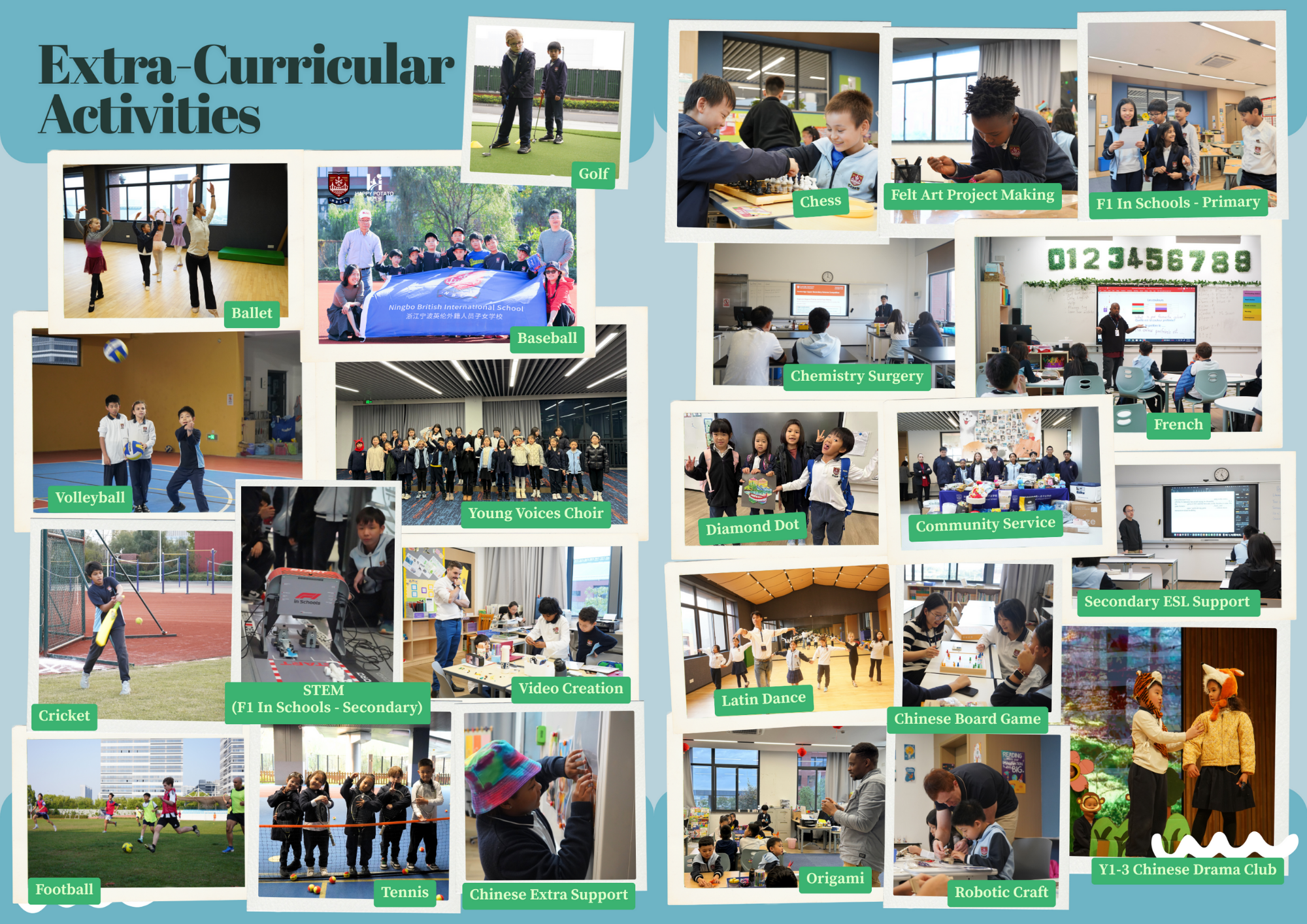 浙江宁波英伦外籍人员子女学校(NBIS)的课外活动课程致力于培养学生的全球视野、创新思维和领导力,让每一位学生都拥有独特的发展机会和无限可能。为了培养学生各项兴趣和爱好,促使他们的才华得到全面发展,NBIS提供了种类丰富的课外活动课程。
